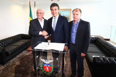 O governador Beto Richa e o secretário de Estado do Desenvolvimento Urbano (SEDU), João Carlos Ortega, assinaram nesta terça-feira, 08, no Palácio Iguaçu, em Curitiba, autorização de licitação e homologação para obras de pavimentação e recape de ruas em Alto Paraná, Florestópolis, Céu Azul, Pranchita, Pato Branco, Borrazópolis, Sengés, Balsa Nova, Piên, Piraquara, Quatro Barras, Campo Magro e Mandirituba. Os documentos foram assinados pelos prefeitos presentes, com a presença do presidente da Assembleia Legislativa, deputado Valdir Rossoni, e outros.
