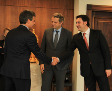 EM PALÁCIO – No período da tarde, o secretário Ratinho Junior, o reitor Daniel Diermeier, acompanhado de Fabio Losso, do professor emérito e membro do Conselho do UniCuritiba, o ex-deputado Ezequias Losso, estiveram no Palácio Iguaçu, onde foram recebidos pelo governador Beto Richa. Eles falaram desta nova parceria – entre a Universidade de Chicago e SEDU/Paranacidade – e, ainda, sobre a retomada de discussões referentes a outro Protocolo de Intenções, assinado em junho de 2014. Este, com o objetivo de promover atividades conjuntas de pesquisas, aperfeiçoamento de informações gerenciais, definição de políticas públicas relacionadas à população carcerária do Estado e à diminuição da violência.