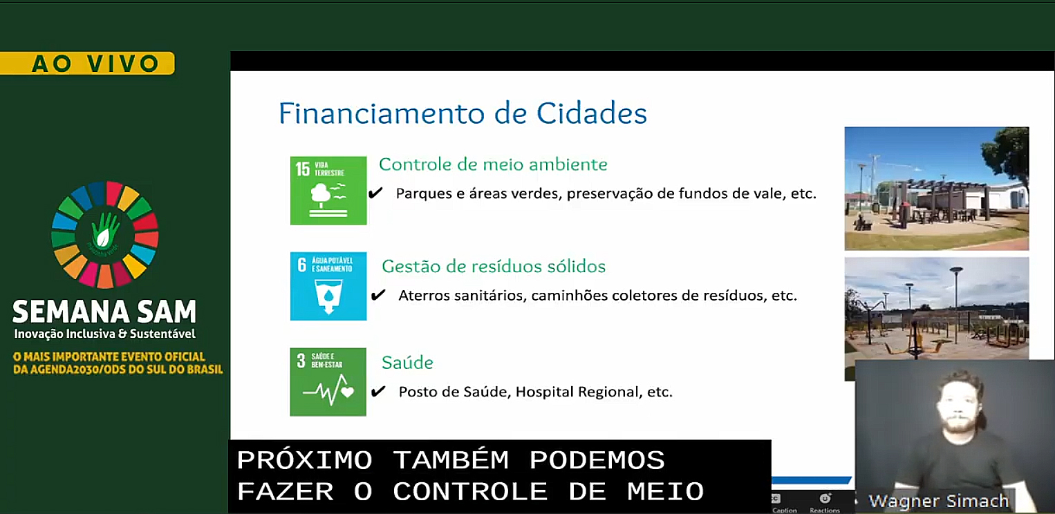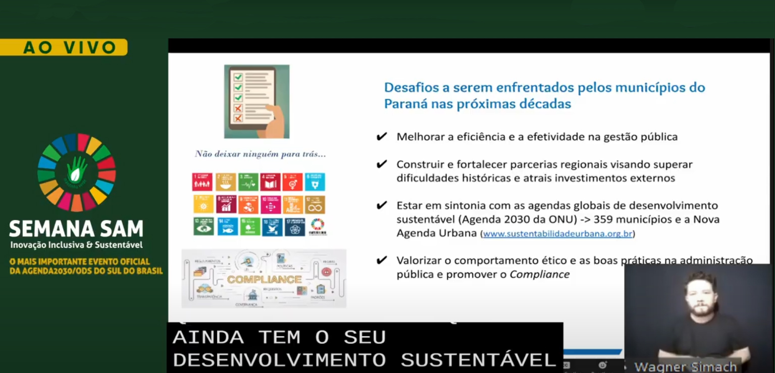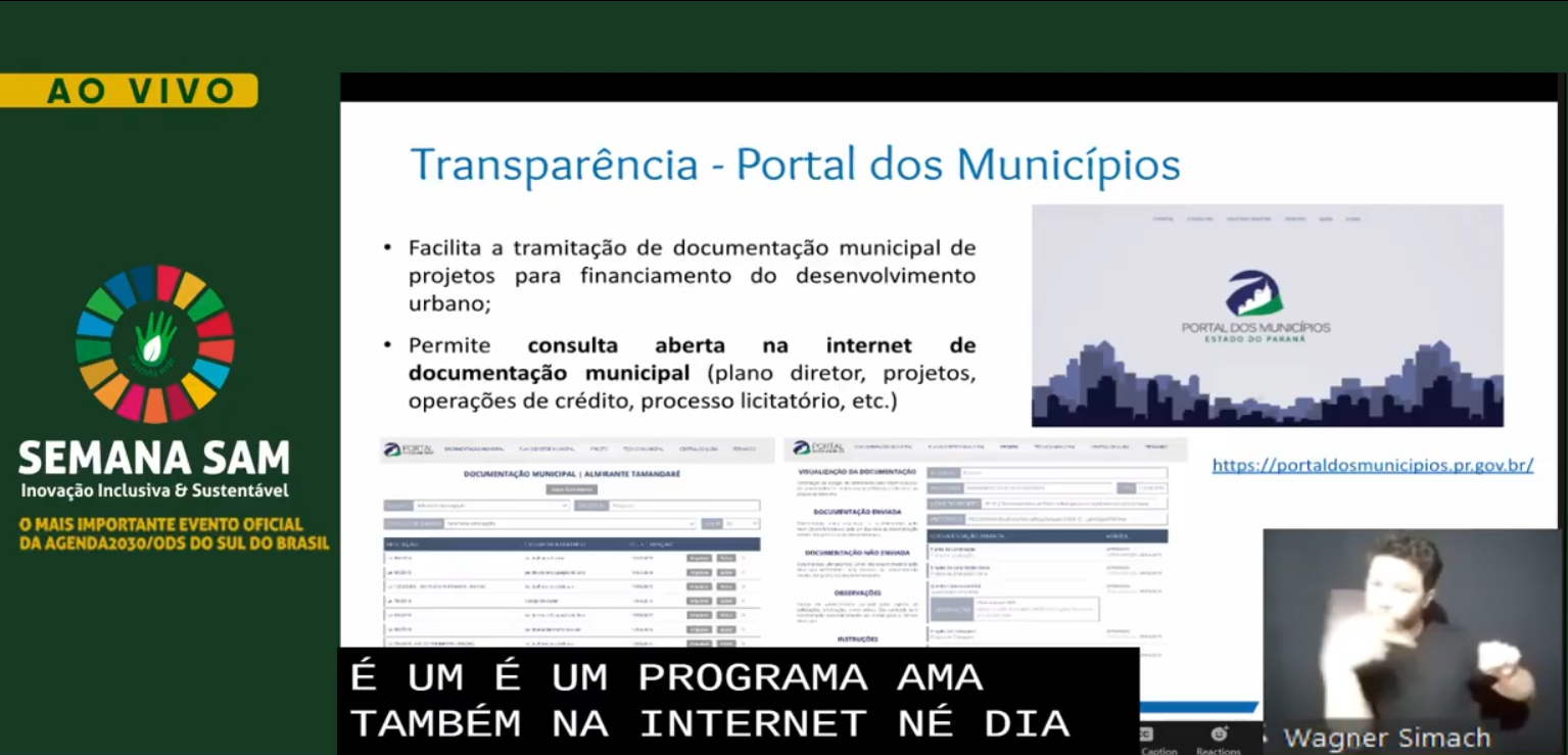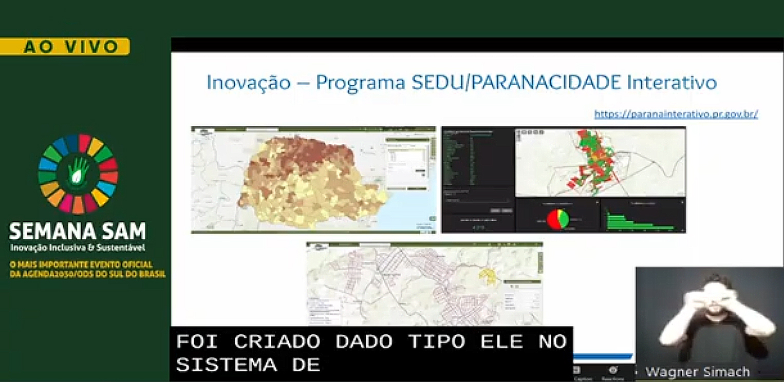 A diretora de Operações do Serviço Social Autônomo (Paranacidade, vinculado à Secretaria do Desenvolvimento Urbano e de Obras Públicas - SEDU), Camila Mileke Scucato, participou, no início da noite desta quarta-feira, 9, do primeiro painel da Semana SAM, evento que neste ano é realizado em formato digital e discute a “Inovação Inclusiva e Sustentável”. A executiva apresentou os programas do Governo do Paraná para estimular a transformação dos municípios em espaços urbanos sustentáveis, resilientes, inclusivos e igualitários, realizados pela SEDU com operação do Paranacidade.