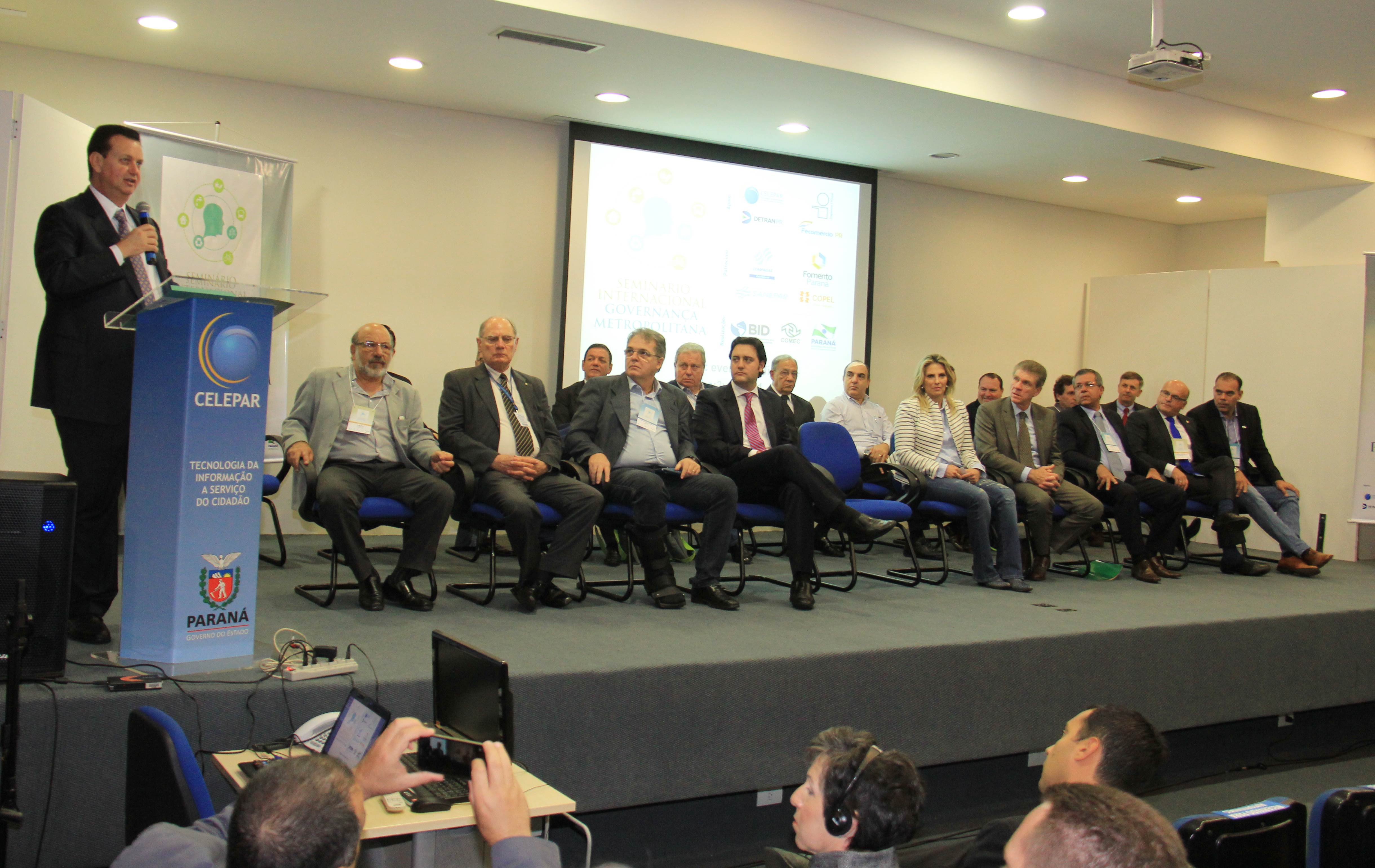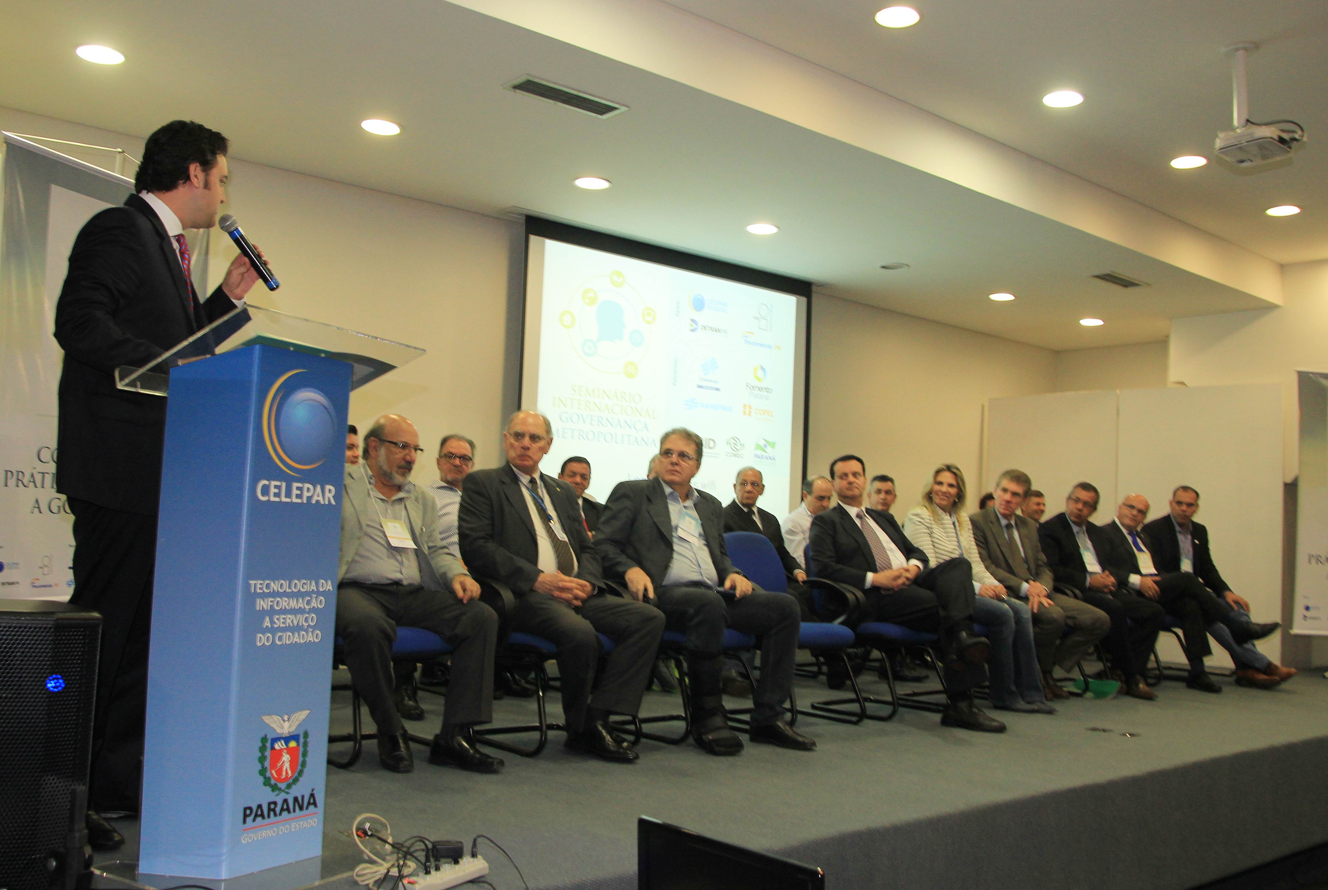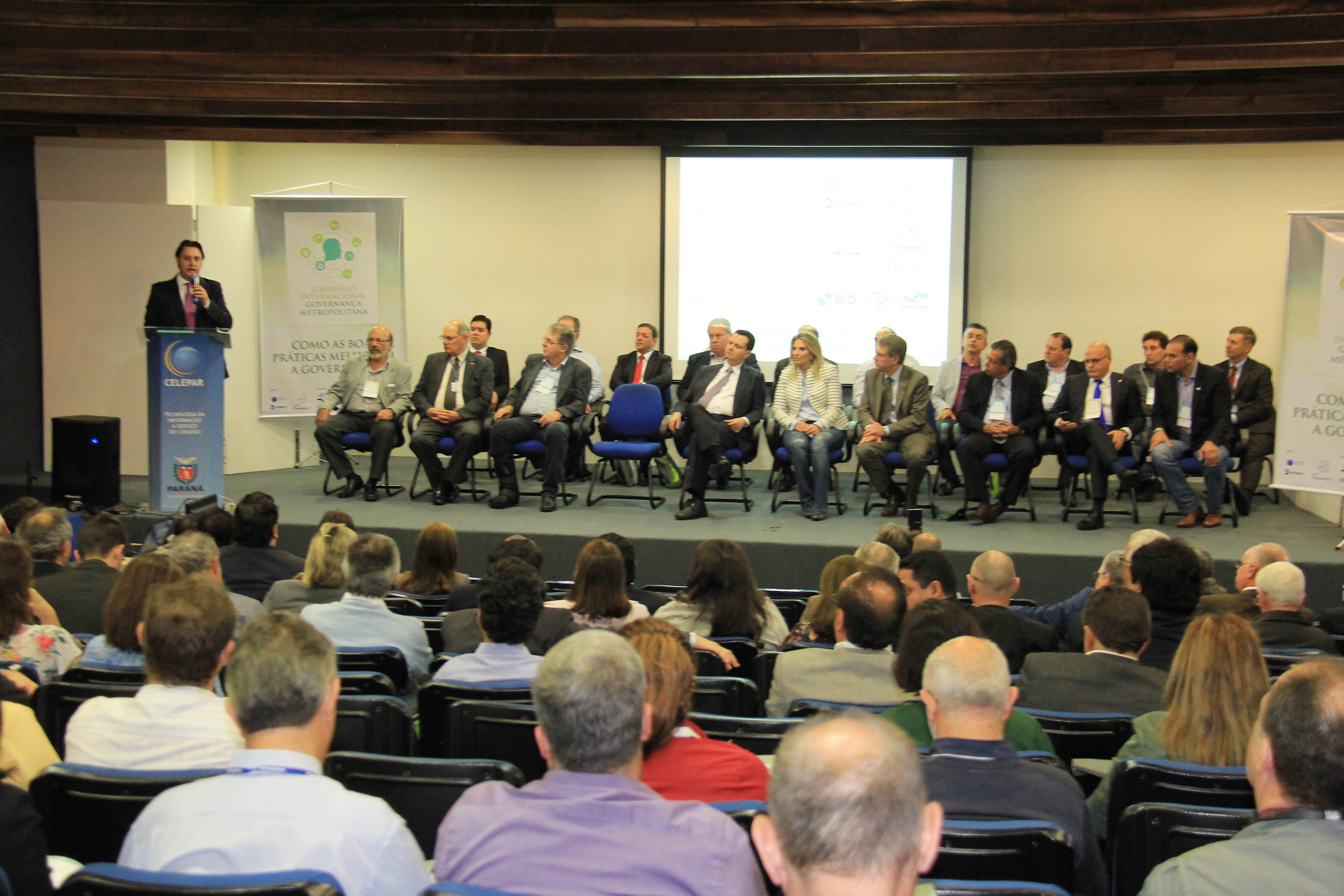 Com a presença de autoridades e especialistas do País e do exterior, acontece hoje e amanhã, quinta e sexta-feira, 22 e 23, o Seminário Internacional sobre Governança Metropolitana, promovido pela Secretaria do Desenvolvimento Urbano (SEDU), por meio da Coordenadoria da Região Metropolitana de Curitiba (COMEC) e com o apoio do Banco Interamericano de Desenvolvimento (BID). O evento teve início na manhã de hoje, 22, no auditório da Celepar, com a presença do ministro das Cidades, Gilberto Kassab, da governadora em exercício, Cida Borghetti, e de secretários de Estado, entre outras personalidades. Kassab falou de sua certeza da contribuição do encontro para a busca de soluções às cidades, em especial às Regiões Metropolitanas e destacou “o extraordinário trabalho realizado pelo secretário (da SEDU), Ratinho Junior que busca trazer para o Paraná discussões e soluções até do exterior para que possa colocar o Estado como referência ao País em questões de infraestrutura, políticas públicas, de serviços necessários à população e para o Estatuto da Metrópole”.