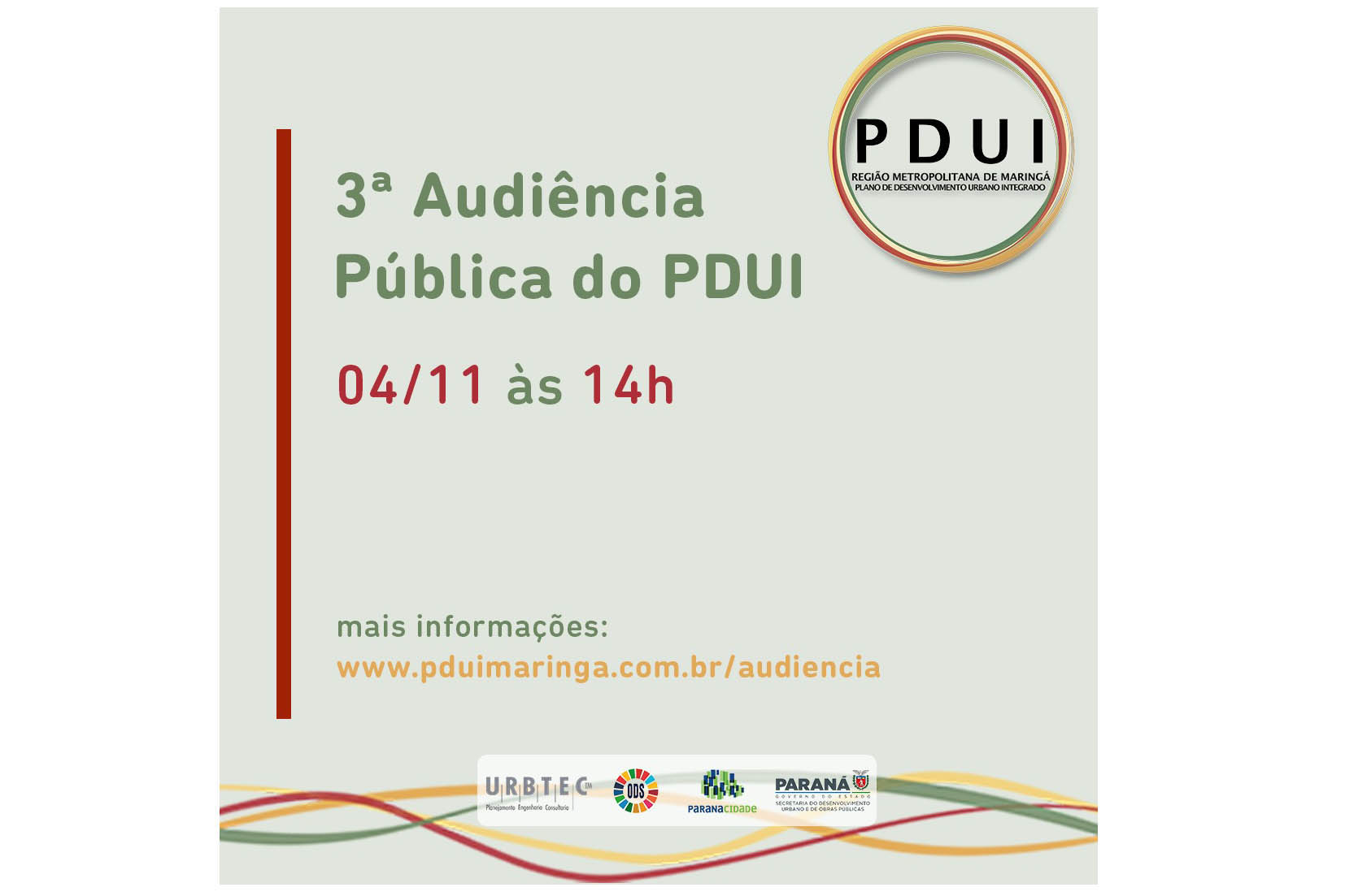 A Secretaria de Estado do Desenvolvimento Urbano e de Obras Públicas (SEDU), com o apoio do Serviço Social Autônomo Paranacidade, convida a população para a Terceira Audiência Pública do Plano de Desenvolvimento Urbano Integrado (PDUI) da Região Metropolitana de Maringá, que acontece nesta sexta-feira, 04, às 14 horas.