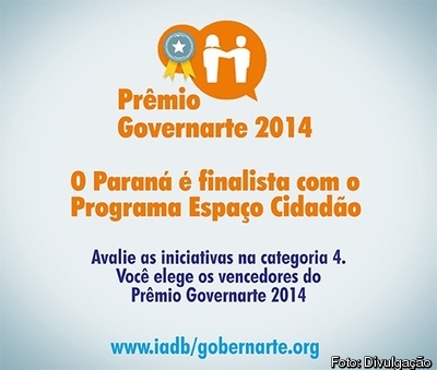 O Programa Espaço Cidadão, do Governo no Estado do Paraná, coordenado pela Secretaria Especial para Assuntos Estratégicos, é classificado como finalista no Prêmio Governarte 2014 – A arte do bom governo, promovido pelo Banco Interamericano de Desenvolvimento (BID). A iniciativa vencedora será conhecida após o término da votação que segue aberta para todo o público. A votação acontece até o dia 08 de dezembro e concorrem ações inovadoras em diferentes áreas da gestão pública em toda a América Latina. Para participar e votar pelo Paraná, clique aqui. O Programa Espaço Cidadão concorre na Categoria 4 – Parceria com o setor privado em nível municipal e apresentou como caso de sucesso os resultados do Espaço Cidadão no município de Anahy.